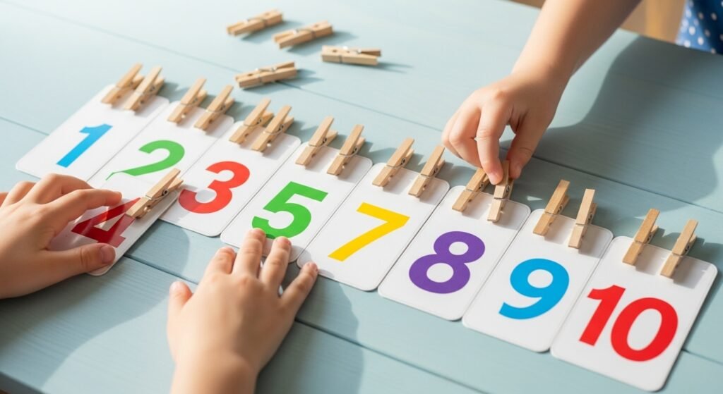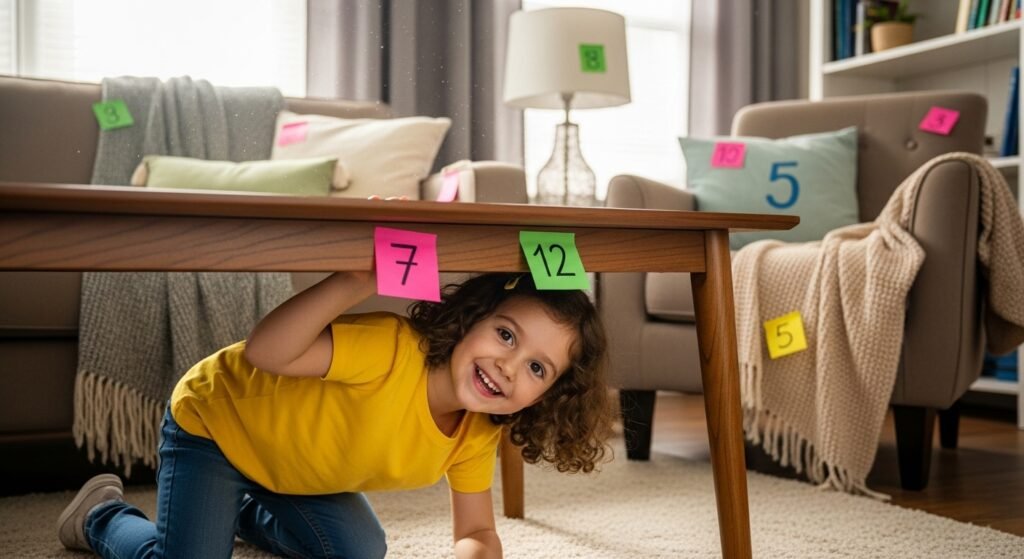 Hide number cards or sticky notes around the house and let kids find them like a treasure hunt.