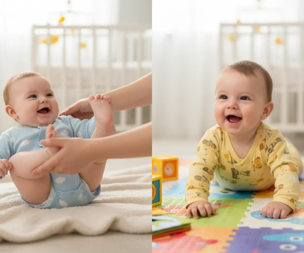 - Grasp Their Ankles:Â Gently hold your baby’s ankles or lower shins.