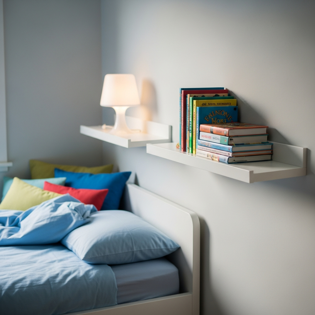 Floor space is precious in a shared room, so look to the walls for storage. Floating shelves placed next to each bed provide a spot for a water bottle, a favorite book, or a nightlight. This replaces the need for floor-standing nightstands and gives each child a dedicated place for their most important items.
