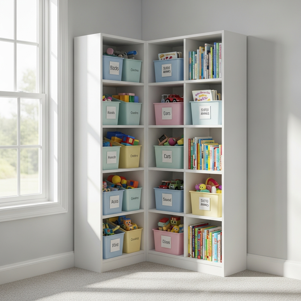 Corners are often underutilized in bedroom design. Installing corner-specific shelving units or rotating carousels can provide significant storage for toys and games. These units help keep the center of the room clear, providing more space for movement and shared activities between the children.