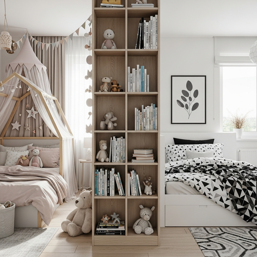 If the age gap between siblings is significant, a physical room divider can provide much-needed independence. Bookshelves that are accessible from both sides serve as both a storage solution and a semi-permanent wall. Alternatively, a folding screen or a hanging fabric divider can offer flexible privacy that can be adjusted as needed.