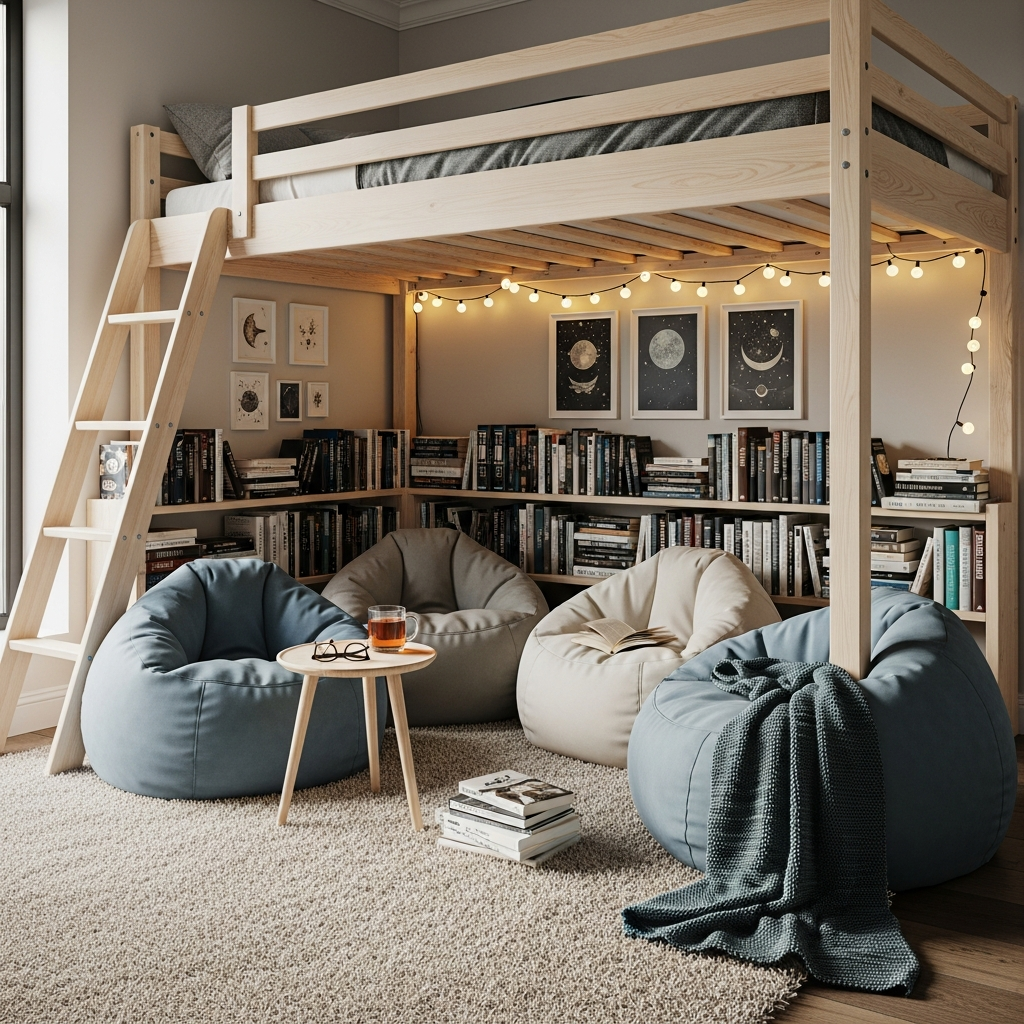 Loft beds elevate the sleeping surface to create a functional area underneath. This lower space can be turned into a reading nook, a playhouse, or even a walk-in closet. For shared rooms, one child could have a loft bed while the other has a standard bed, creating a dynamic multi-level environment that feels larger than it actually is.