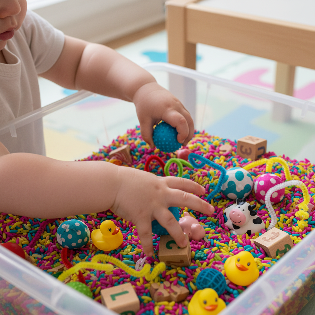 • Rice Bin Exploration: A large container filled with dry rice, small scoops, measuring cups, and hidden toys provides a calming, tactile experience.