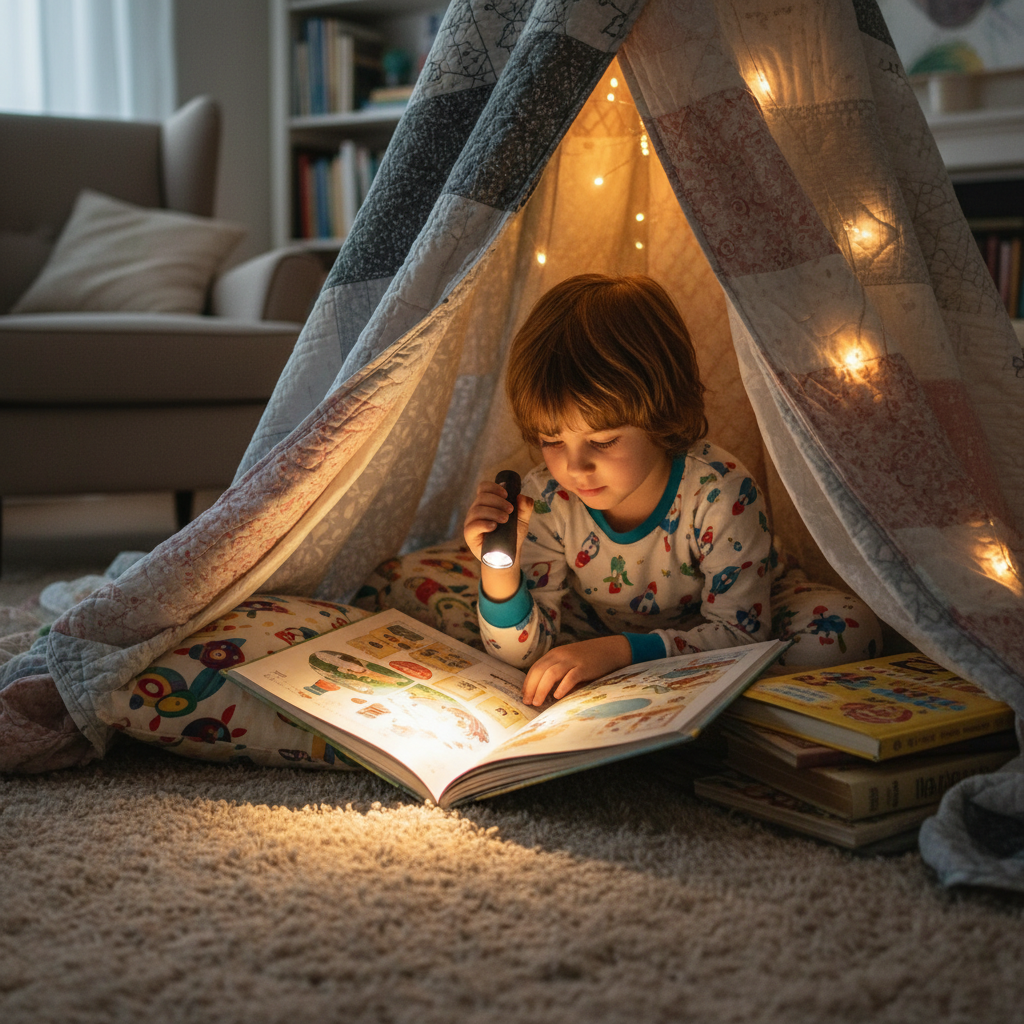 • Build a Reading Fort: Create a cozy blanket fort and read stories inside with a flashlight.