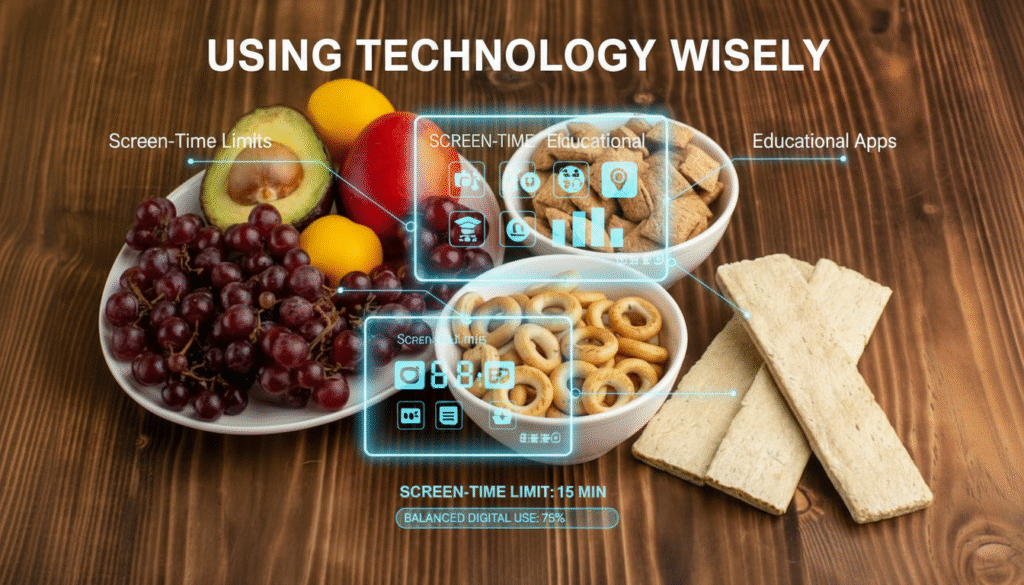 • Set screen-time limits and designate tech-free zones (like the dinner table).
