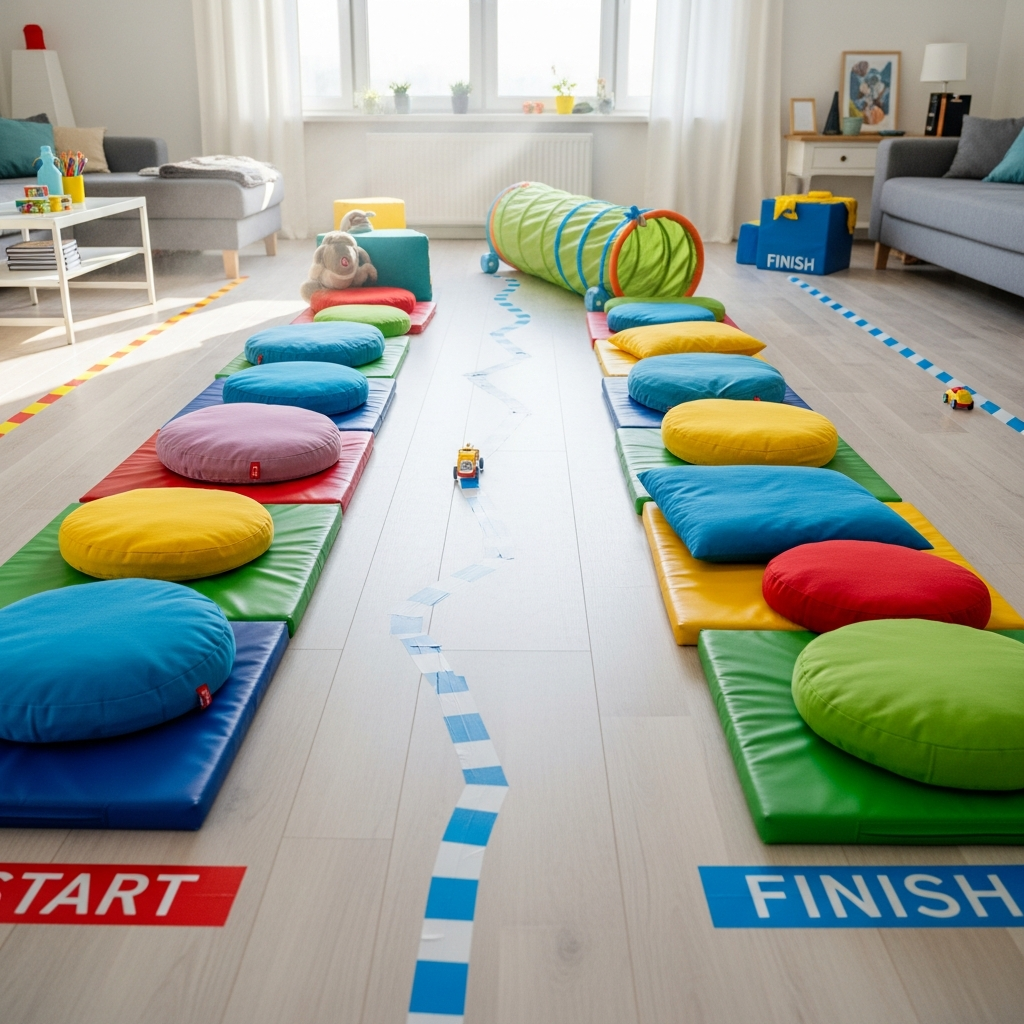 Physical activity is essential even when confined to the indoors. Use common household items like pillows, painter’s tape, and chairs to create a safe yet challenging course. Encourage children to crawl under tables, jump over cushion mountains, or balance on tape lines. This activity improves motor skills and provides a healthy outlet for energy without requiring expensive equipment or outdoor space.