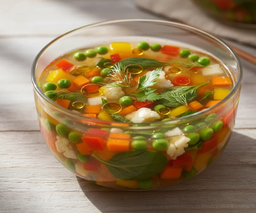 - Preparation: Sauté carrots, celery, and bell pepper until slightly softened. Add broth and green beans, simmer. Add peas, corn, and spinach just before serving so they retain their color and crunch.