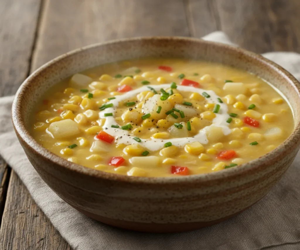- Key Ingredients:Â Corn kernels (fresh or frozen), potatoes (small diced), onion, red bell pepper (finely diced), vegetable broth, milk, a little flour or cornstarch for thickening, optional: a tiny bit of crispy bacon bits for topping.