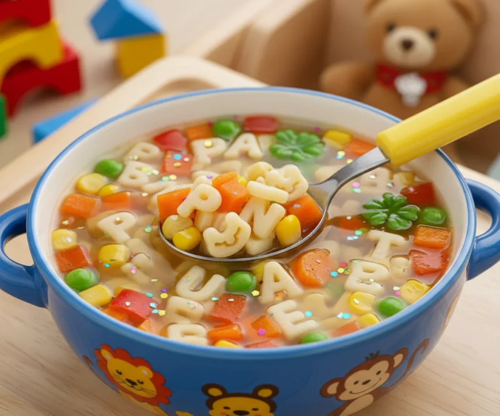 - Key Ingredients:Â Alphabet pasta, carrots, peas, corn, celery (finely diced), chicken or vegetable broth, a touch of parsley.