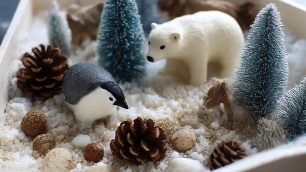 No snow? Use cotton balls, baking soda, or even shredded paper to create a “snowy” substitute.